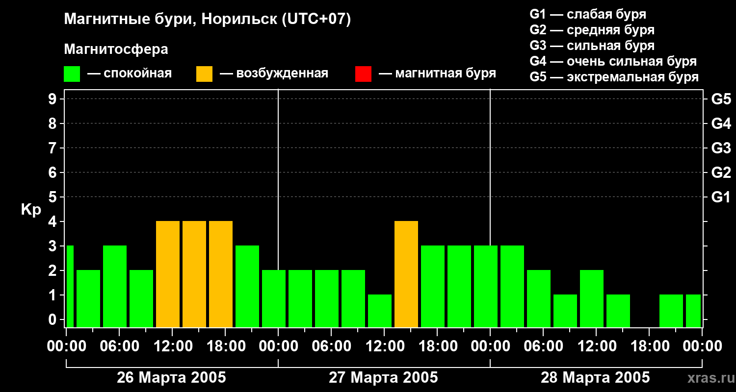 Изменения геомагнитного индекса Kp с 26 по 28 марта 2005 года для средних широт