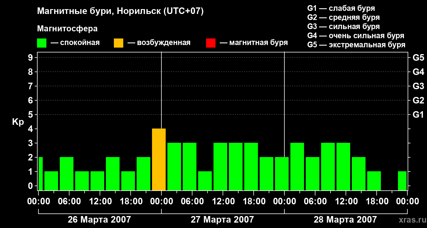 Изменения геомагнитного индекса Kp с 26 по 28 марта 2007 года для средних широт