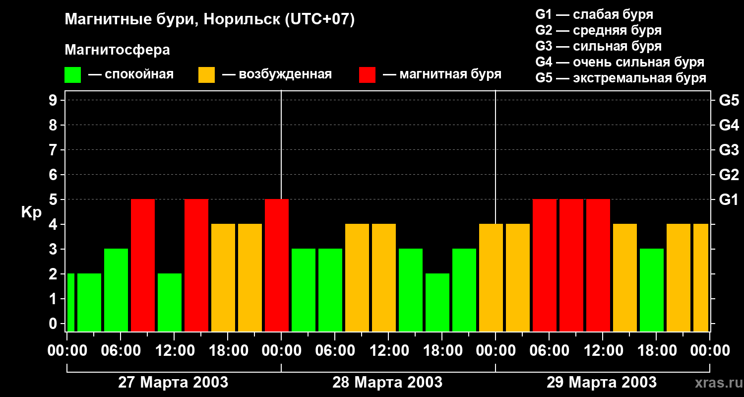 Изменения геомагнитного индекса Kp с 27 по 29 марта 2003 года для средних широт