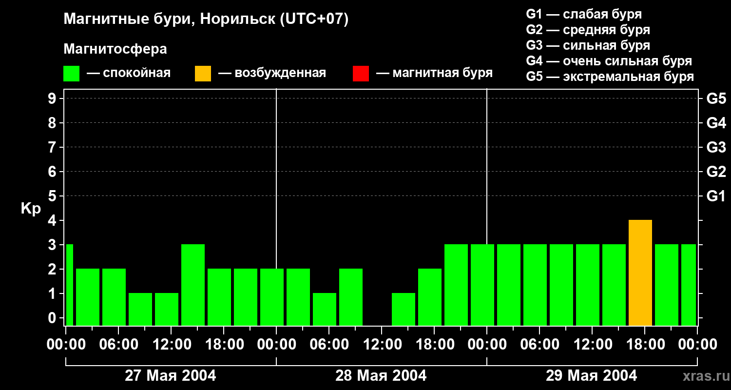 Изменения геомагнитного индекса Kp с 27 по 29 мая 2004 года для средних широт