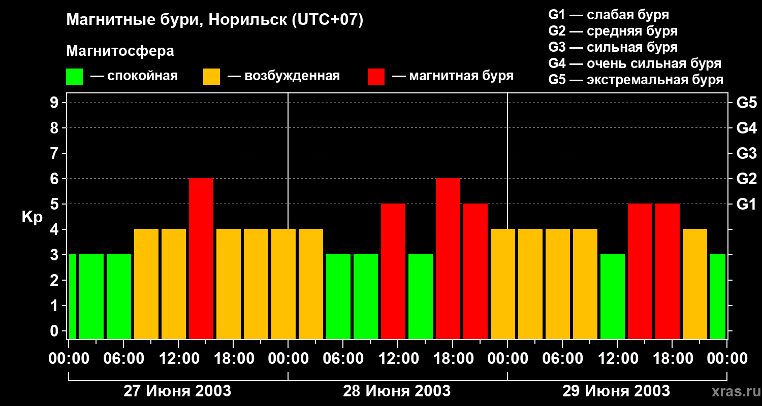 Изменения геомагнитного индекса Kp с 27 по 29 июня 2003 года для средних широт