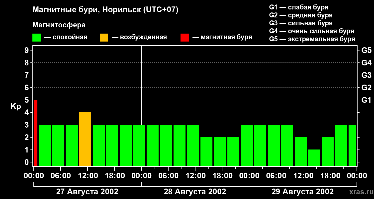 Изменения геомагнитного индекса Kp с 27 по 29 августа 2002 года для средних широт
