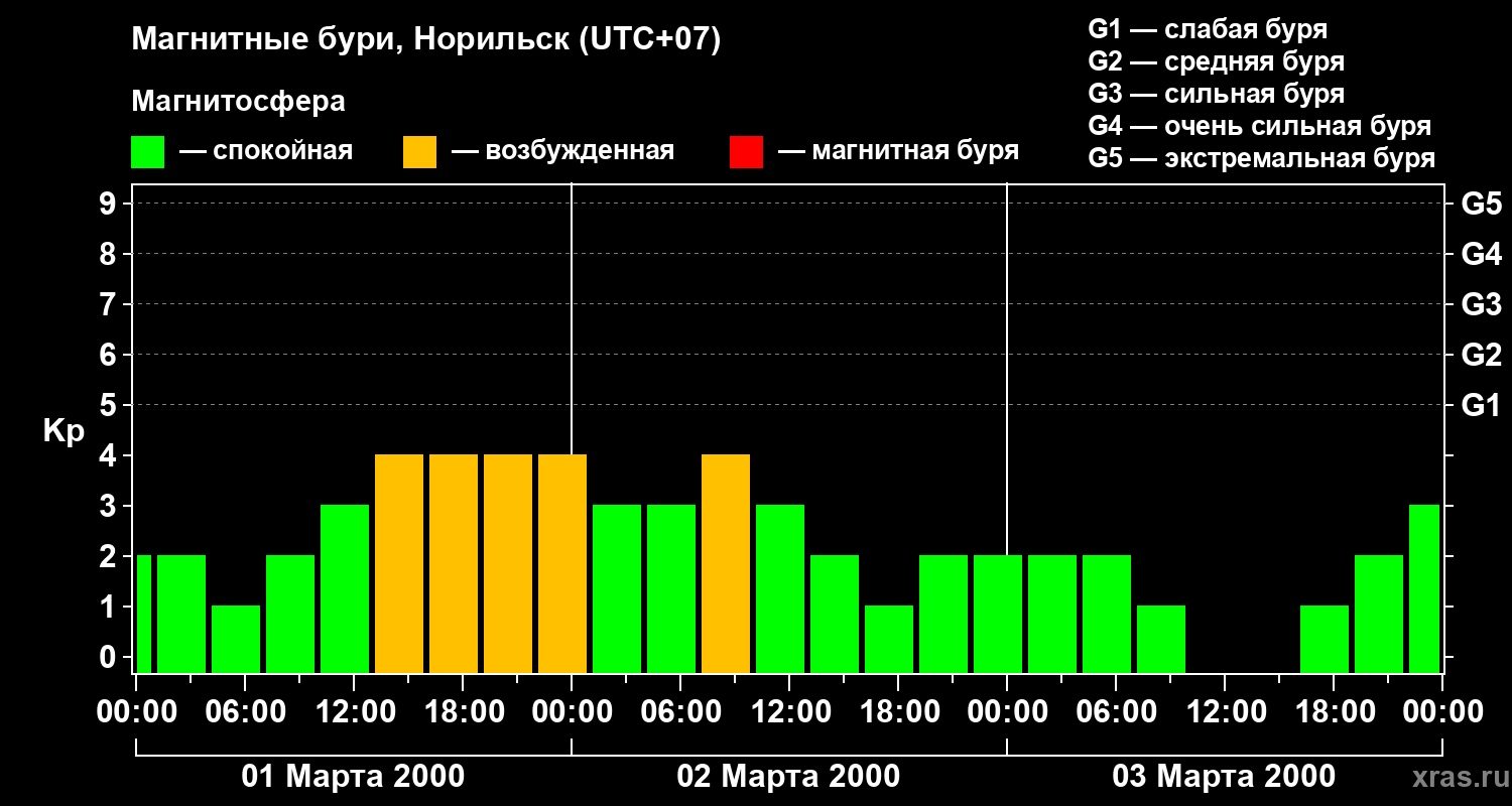 Изменения геомагнитного индекса Kp с 1 по 3 марта 2000 года для средних широт