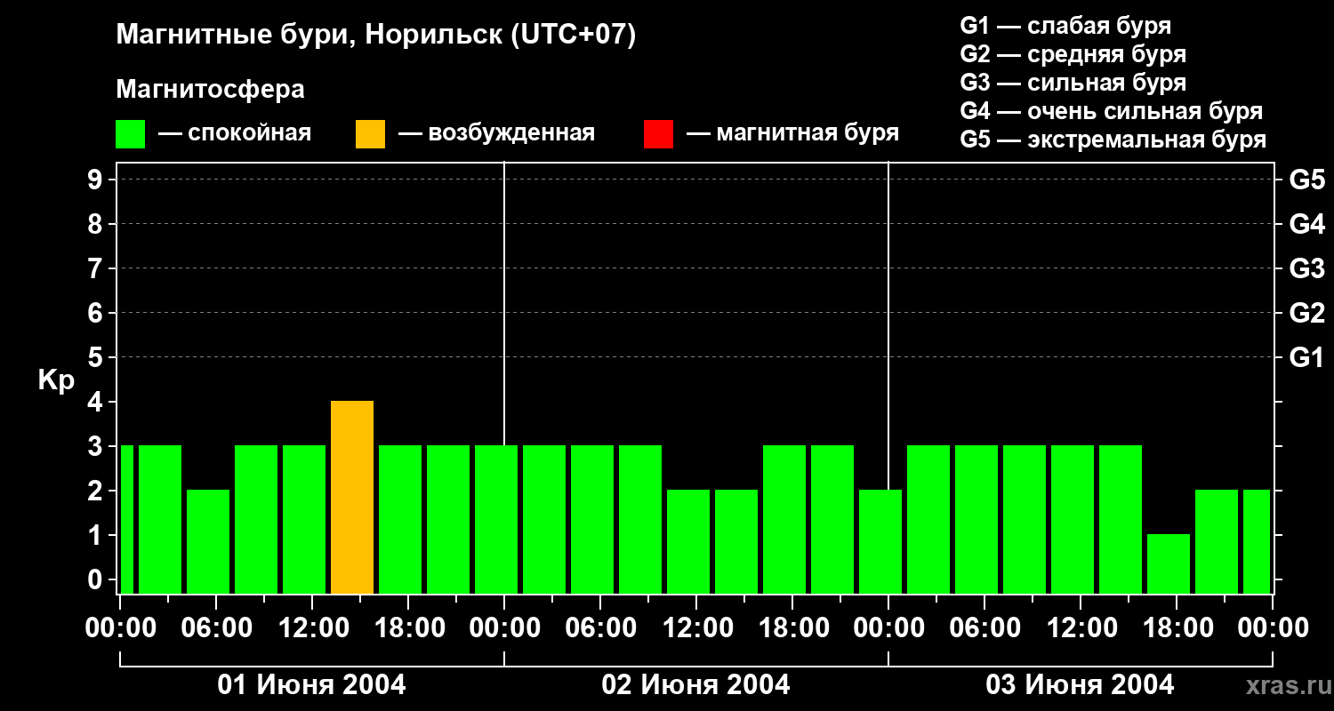 Изменения геомагнитного индекса Kp с 1 по 3 июня 2004 года для средних широт