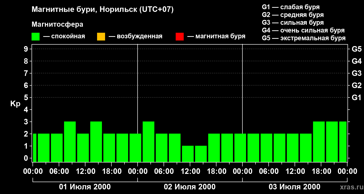 Изменения геомагнитного индекса Kp с 1 по 3 июля 2000 года для средних широт