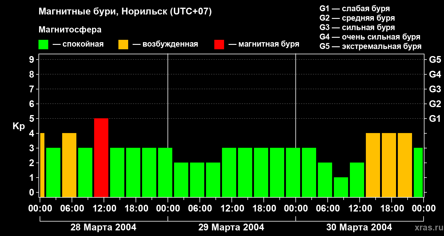 Изменения геомагнитного индекса Kp с 28 по 30 марта 2004 года для средних широт