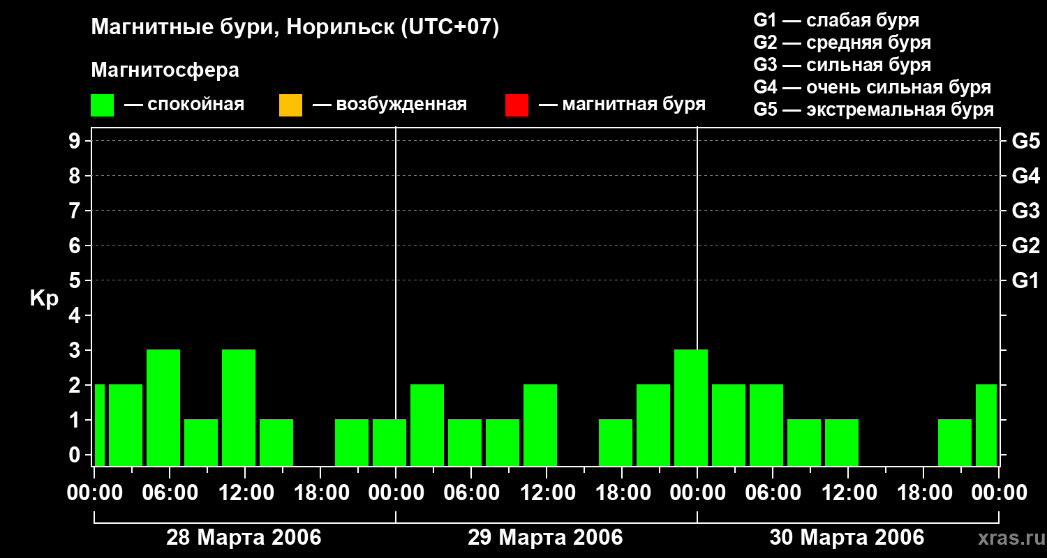 Изменения геомагнитного индекса Kp с 28 по 30 марта 2006 года для средних широт