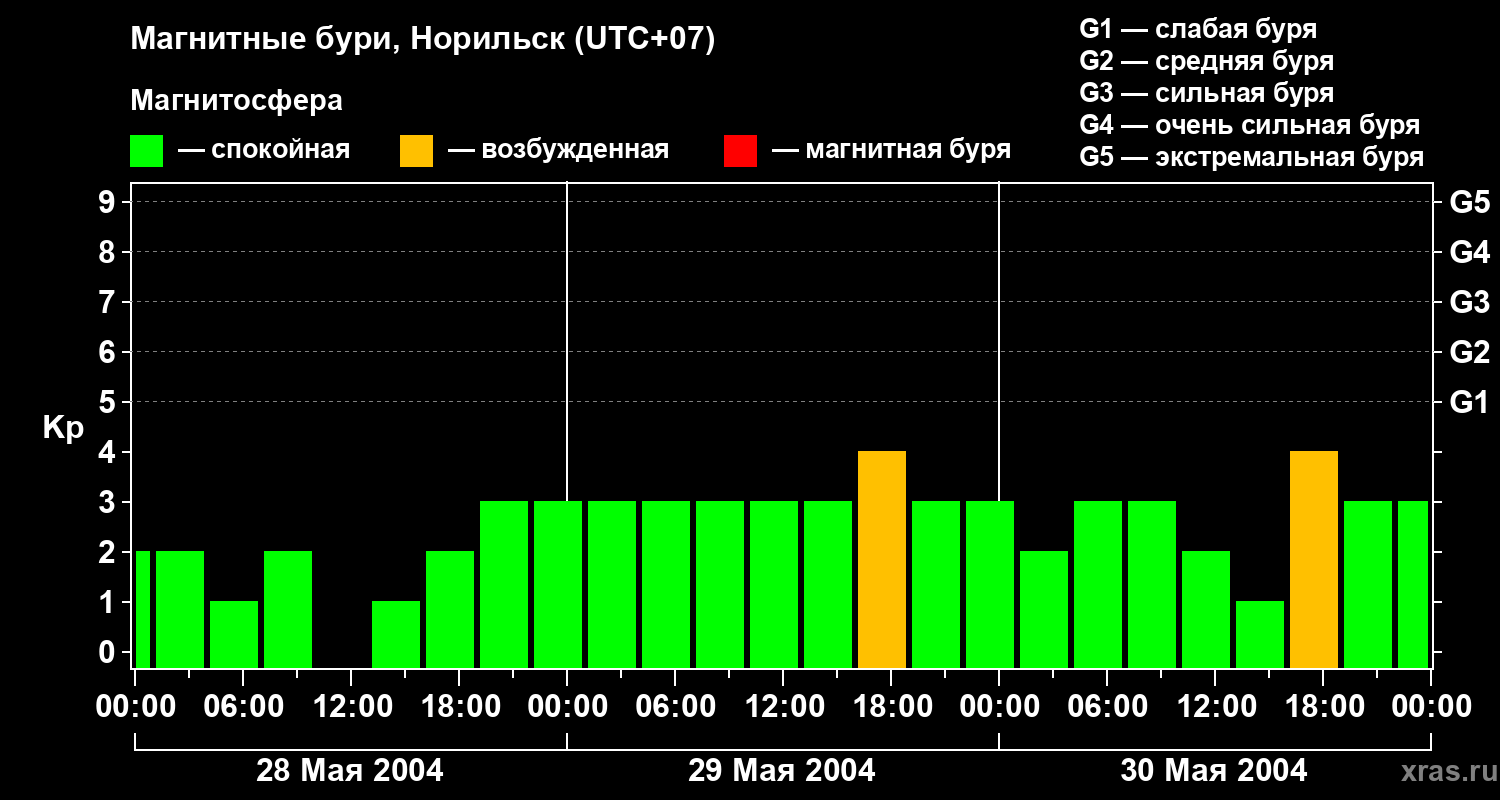Изменения геомагнитного индекса Kp с 28 по 30 мая 2004 года для средних широт