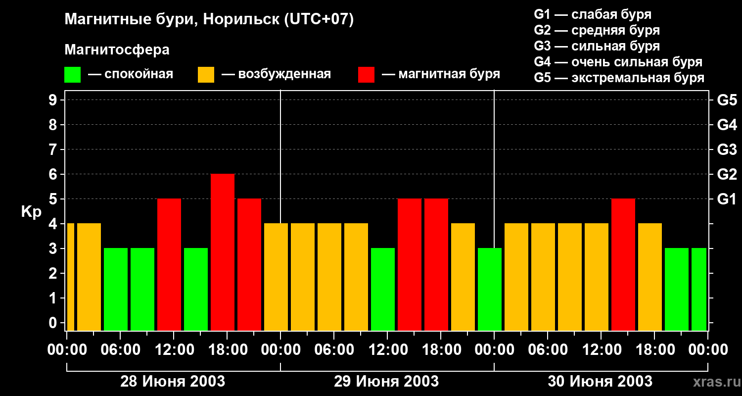 Изменения геомагнитного индекса Kp с 28 по 30 июня 2003 года для средних широт