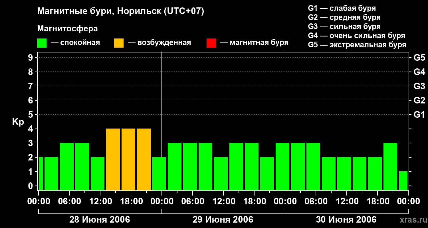 Изменения геомагнитного индекса Kp с 28 по 30 июня 2006 года для средних широт