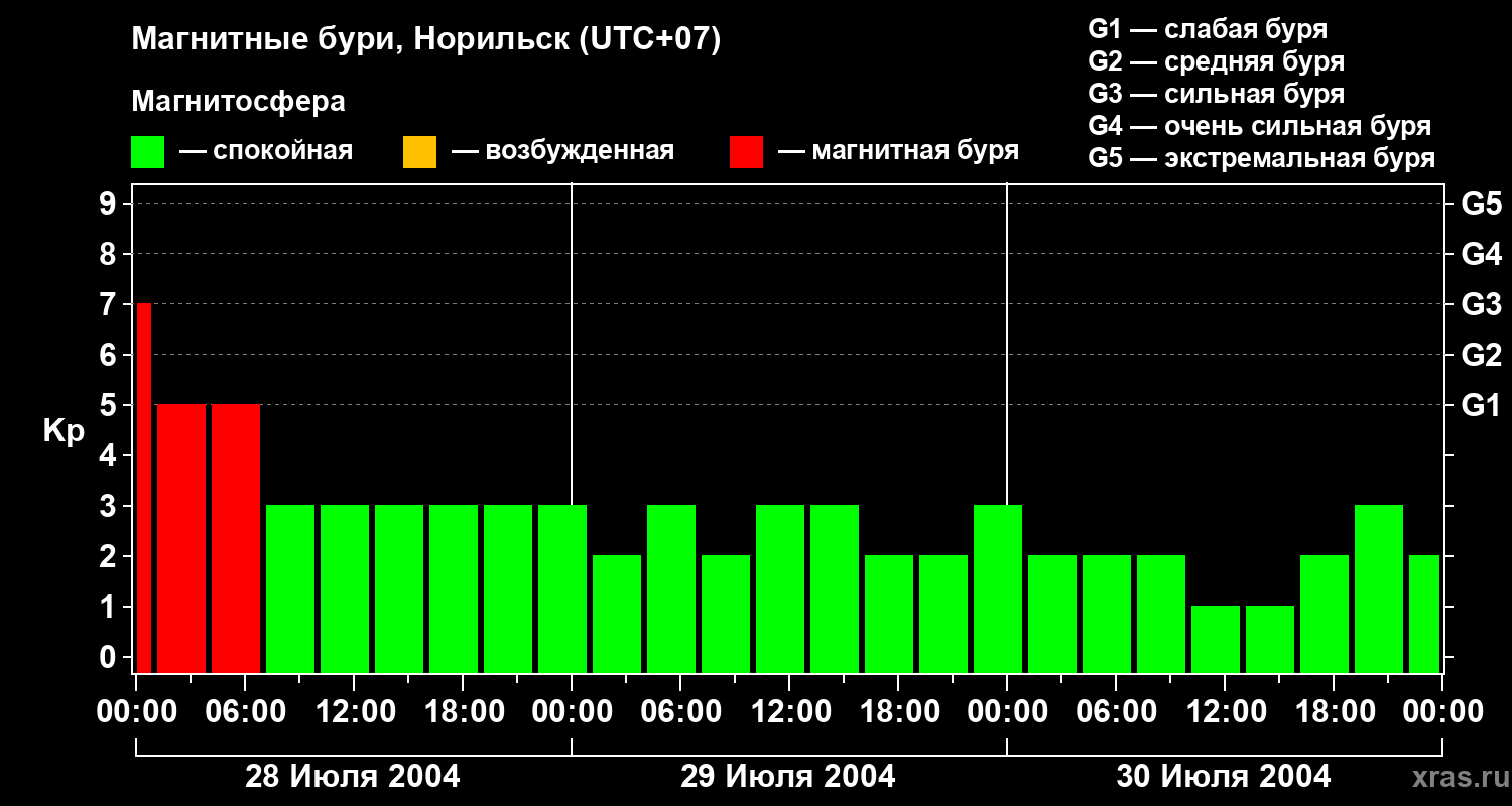 Изменения геомагнитного индекса Kp с 28 по 30 июля 2004 года для средних широт