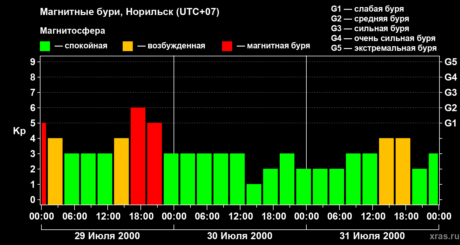 Изменения геомагнитного индекса Kp с 29 по 31 июля 2000 года для средних широт