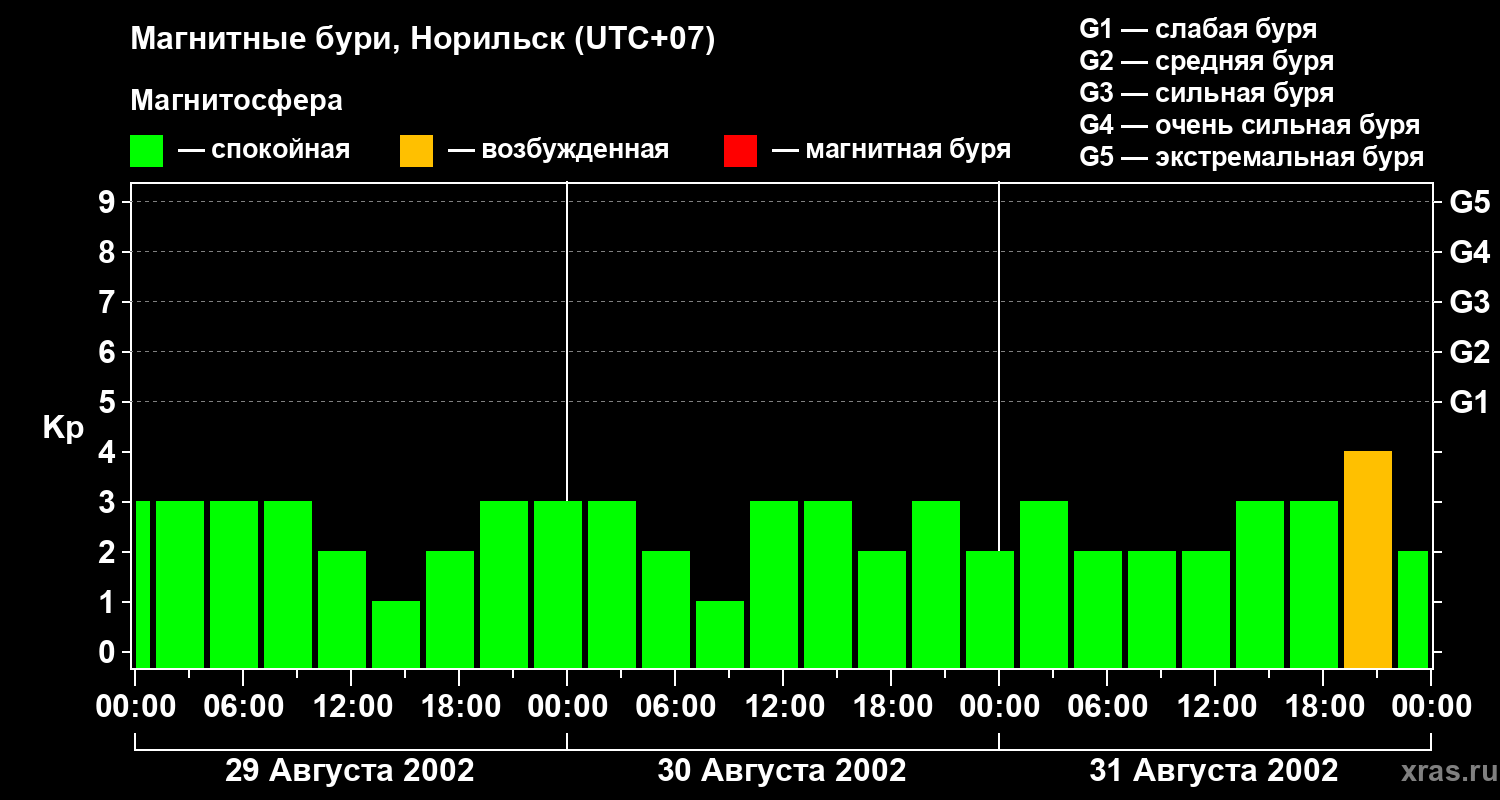Изменения геомагнитного индекса Kp с 29 по 31 августа 2002 года для средних широт