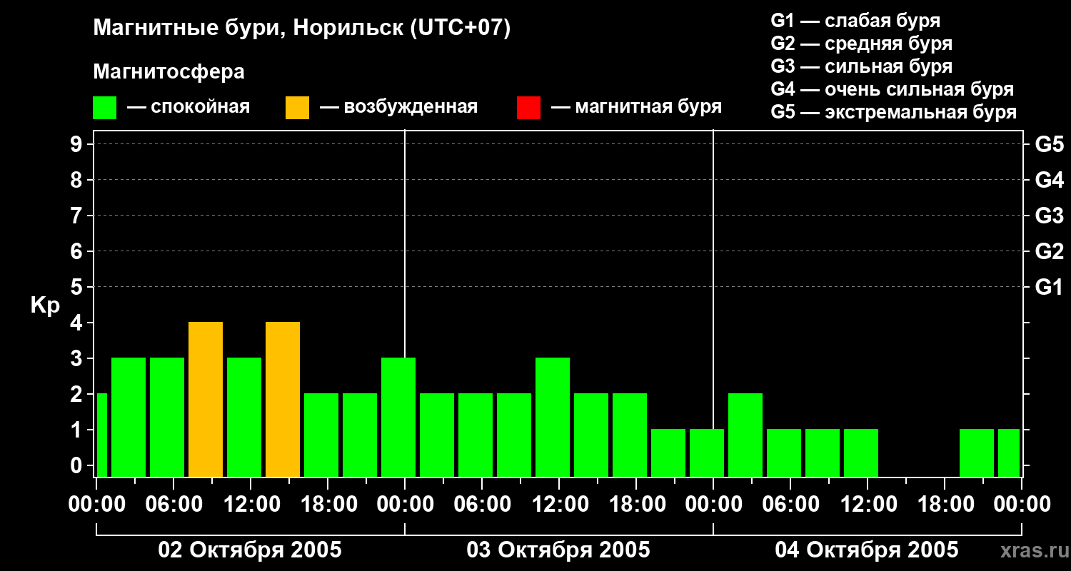 Изменения геомагнитного индекса Kp с 2 по 4 октября 2005 года для средних широт