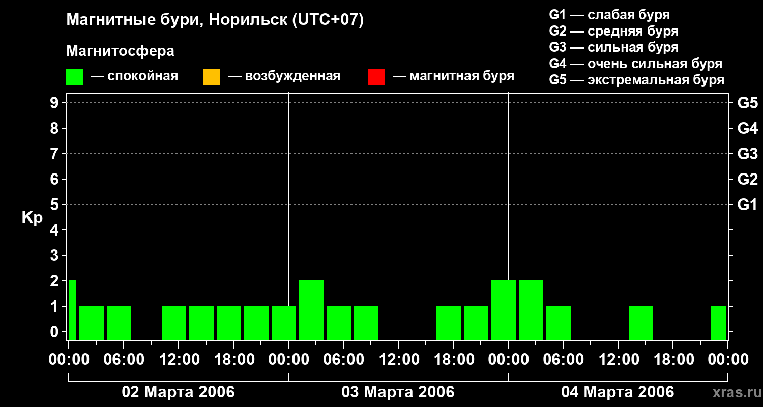 Изменения геомагнитного индекса Kp с 2 по 4 марта 2006 года для средних широт