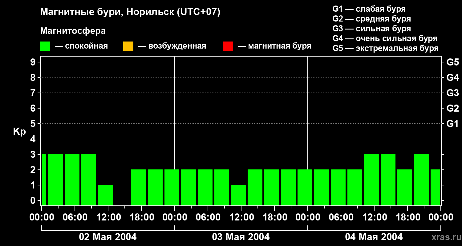 Изменения геомагнитного индекса Kp с 2 по 4 мая 2004 года для средних широт