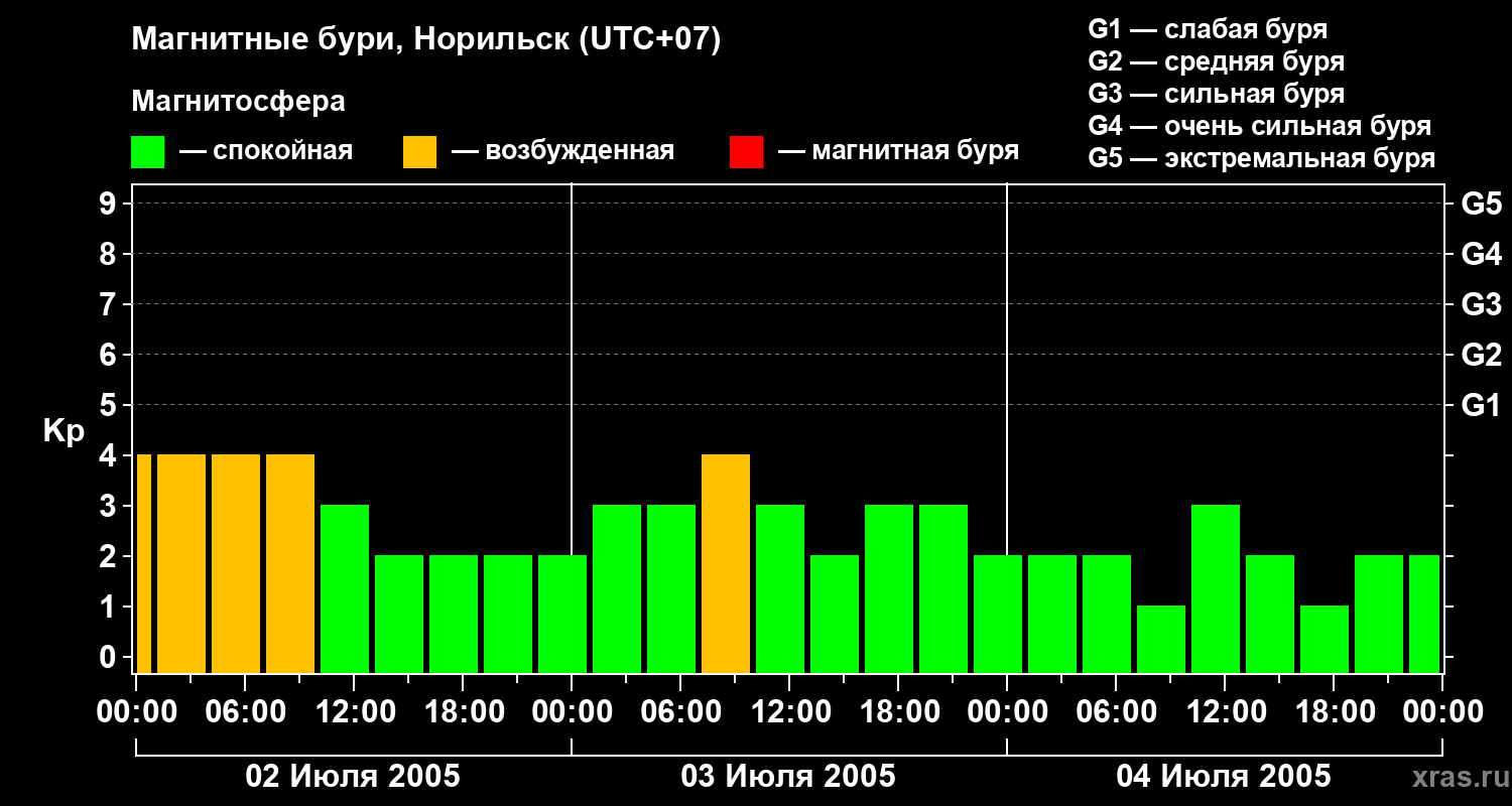 Изменения геомагнитного индекса Kp с 2 по 4 июля 2005 года для средних широт