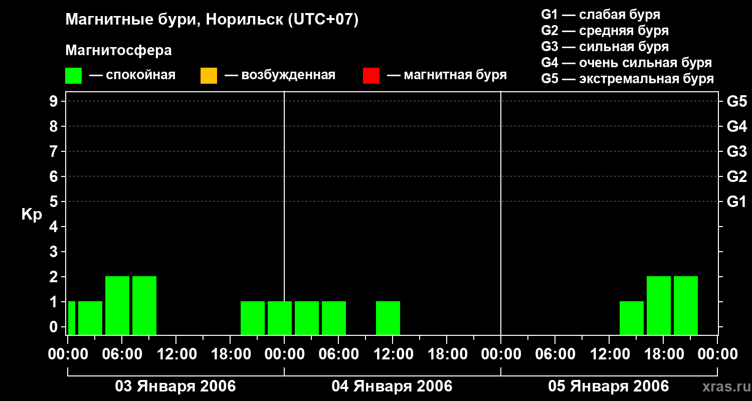 Изменения геомагнитного индекса Kp с 3 по 5 января 2006 года для средних широт