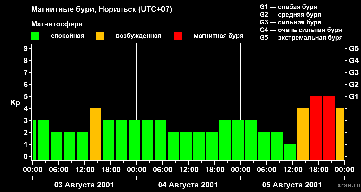 Изменения геомагнитного индекса Kp с 3 по 5 августа 2001 года для средних широт