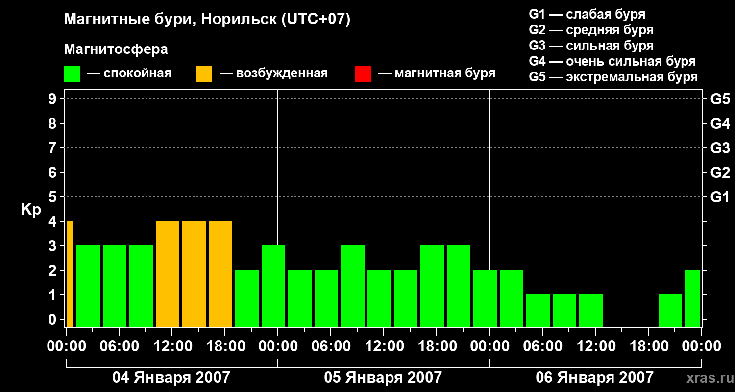 Изменения геомагнитного индекса Kp с 4 по 6 января 2007 года для средних широт