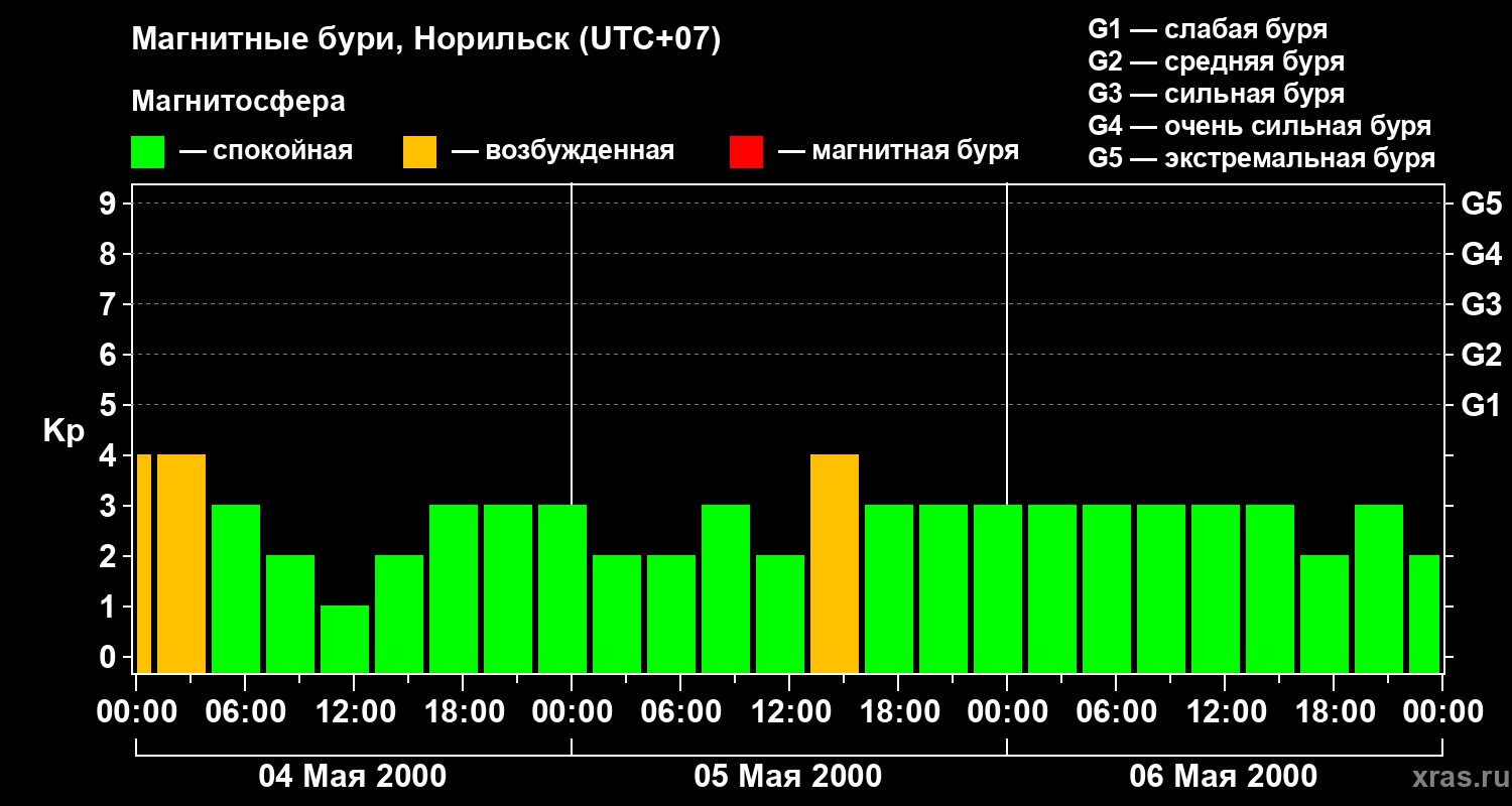 Изменения геомагнитного индекса Kp с 4 по 6 мая 2000 года для средних широт