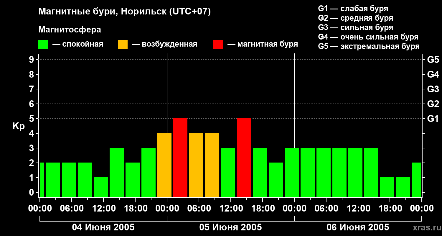 Изменения геомагнитного индекса Kp с 4 по 6 июня 2005 года для средних широт
