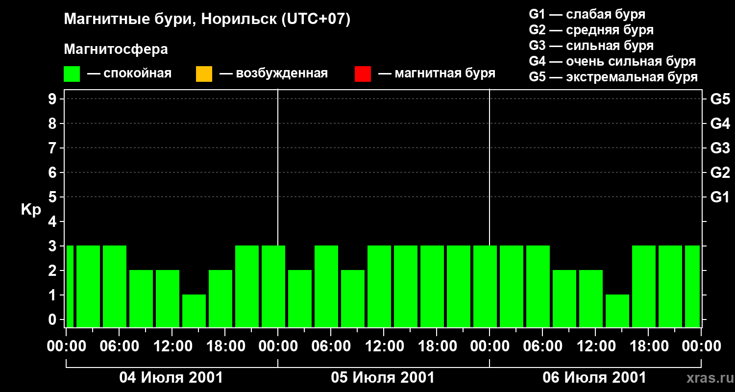Изменения геомагнитного индекса Kp с 4 по 6 июля 2001 года для средних широт