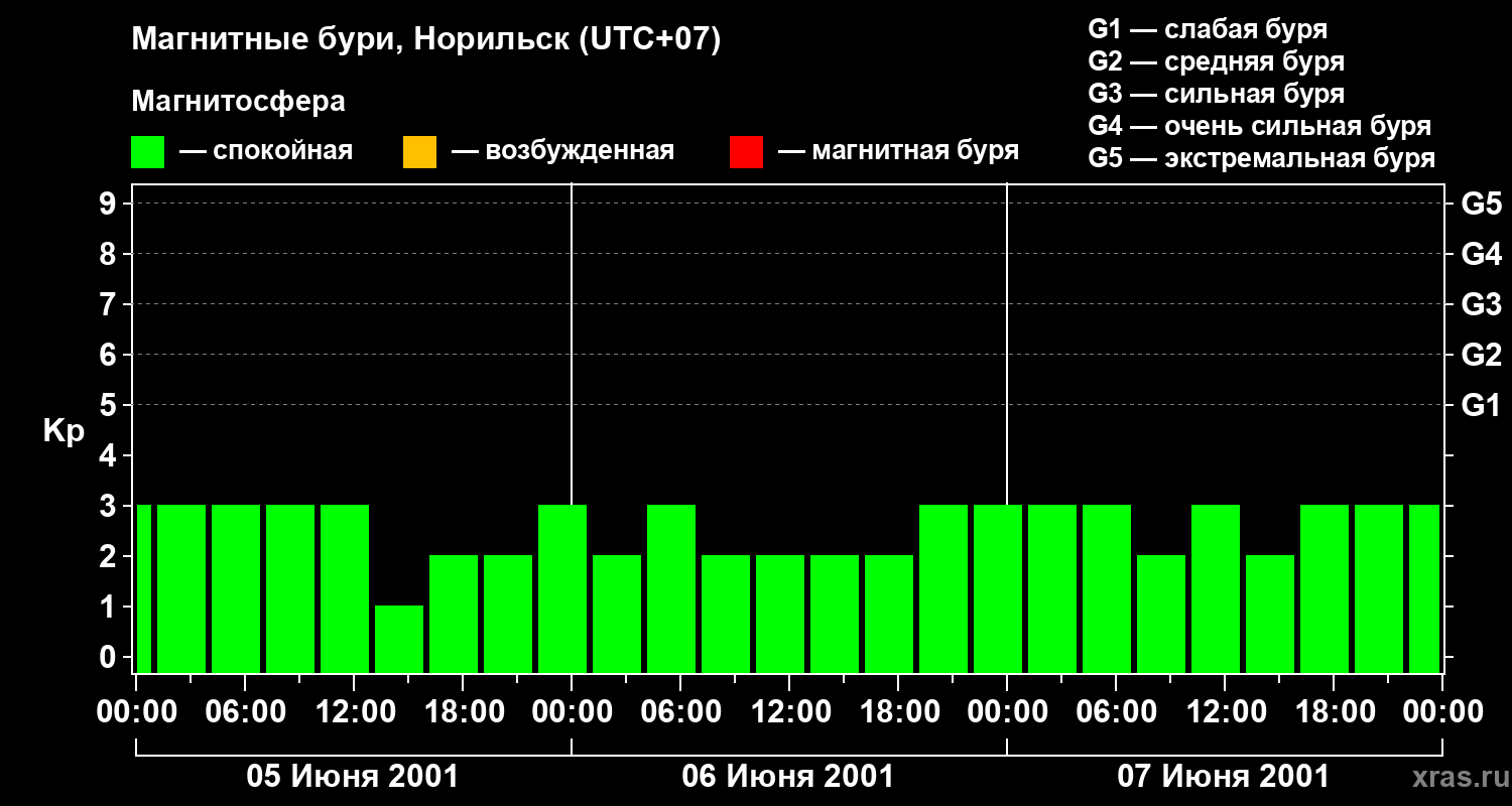 Изменения геомагнитного индекса Kp с 5 по 7 июня 2001 года для средних широт