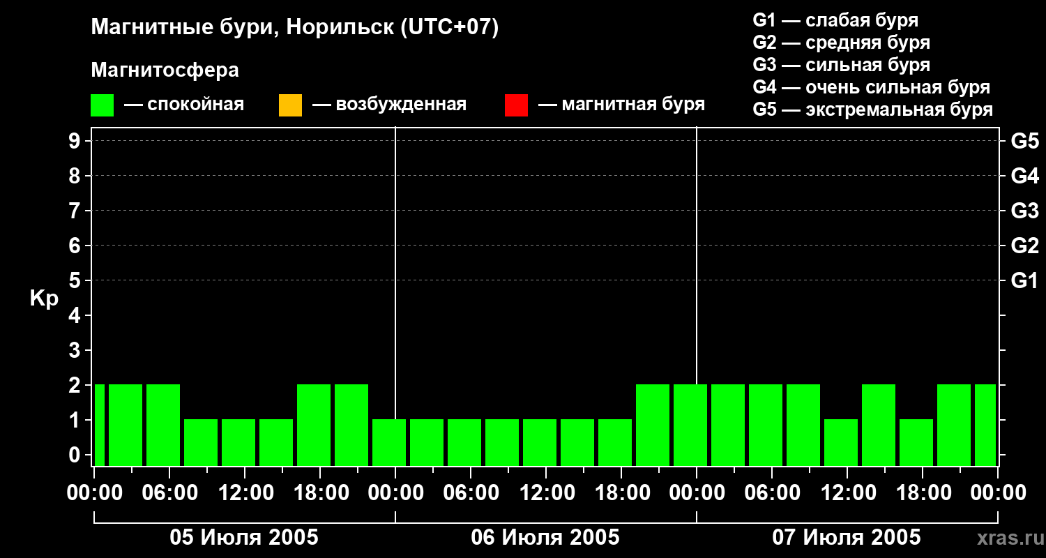 Изменения геомагнитного индекса Kp с 5 по 7 июля 2005 года для средних широт