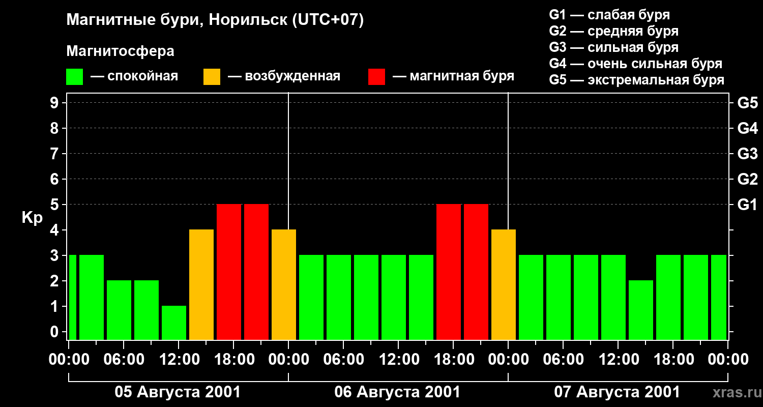 Изменения геомагнитного индекса Kp с 5 по 7 августа 2001 года для средних широт