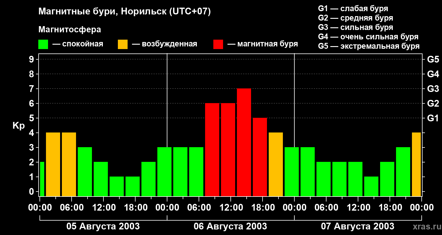 Изменения геомагнитного индекса Kp с 5 по 7 августа 2003 года для средних широт