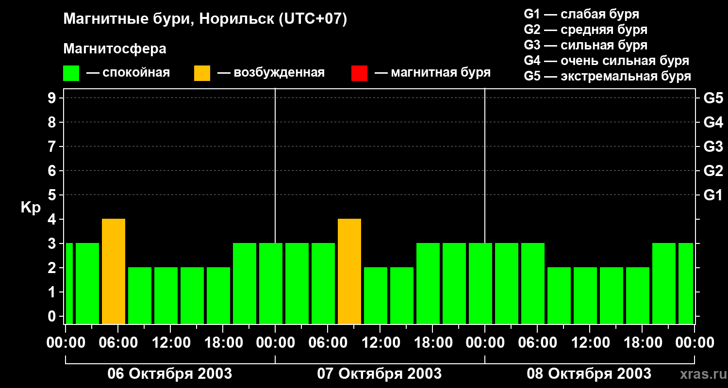 Изменения геомагнитного индекса Kp с 6 по 8 октября 2003 года для средних широт