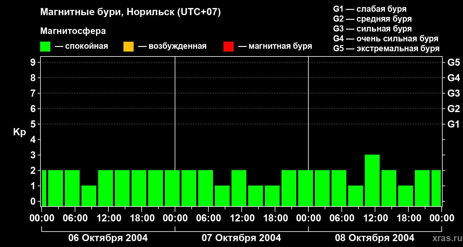 Изменения геомагнитного индекса Kp с 6 по 8 октября 2004 года для средних широт