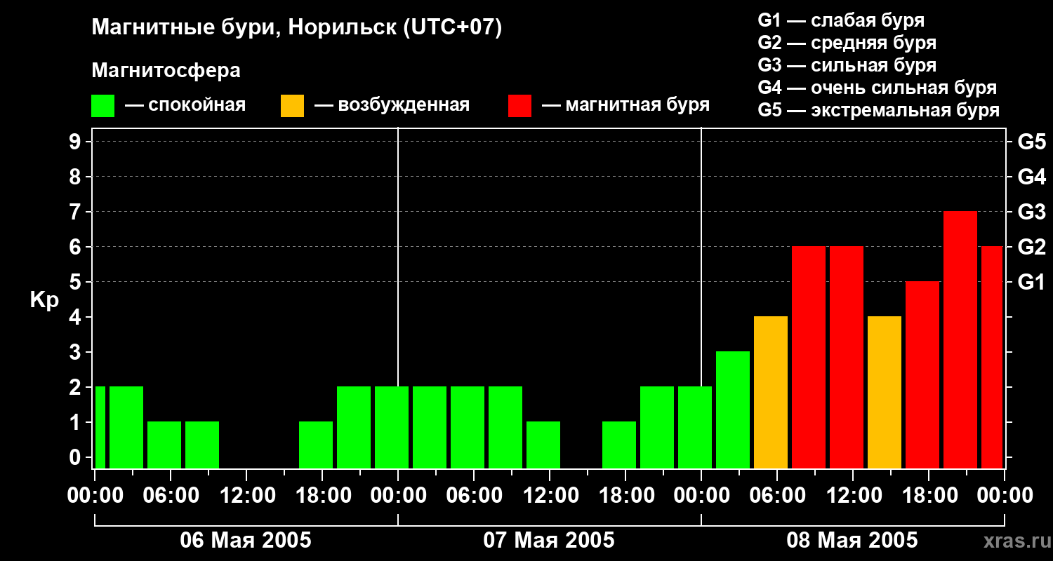 Изменения геомагнитного индекса Kp с 6 по 8 мая 2005 года для средних широт