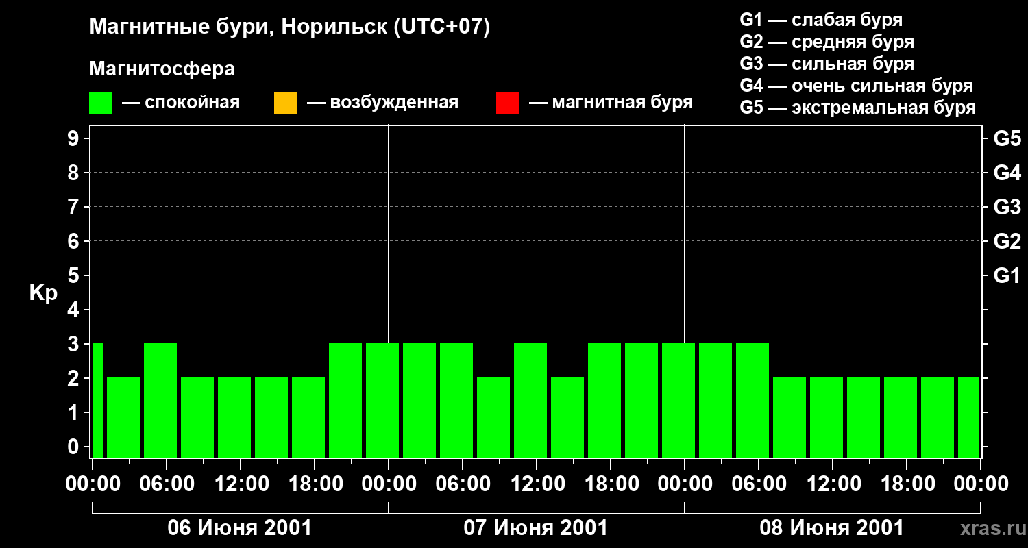 Изменения геомагнитного индекса Kp с 6 по 8 июня 2001 года для средних широт