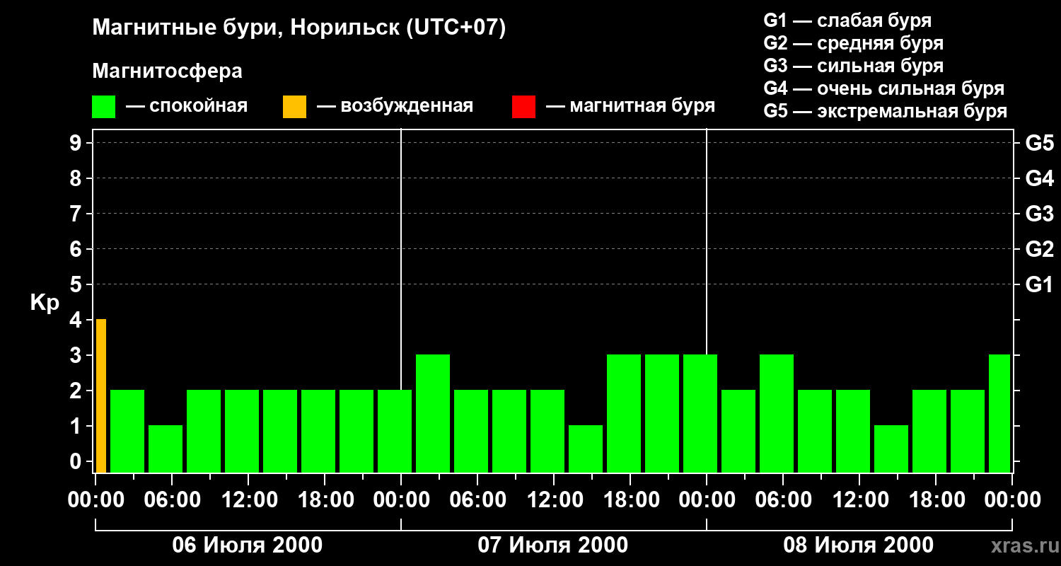 Изменения геомагнитного индекса Kp с 6 по 8 июля 2000 года для средних широт