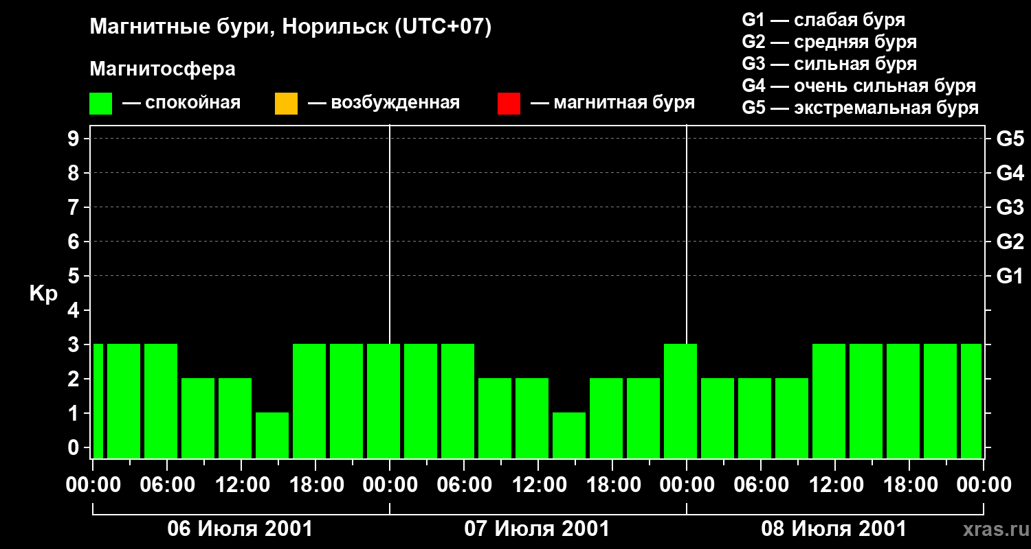 Изменения геомагнитного индекса Kp с 6 по 8 июля 2001 года для средних широт