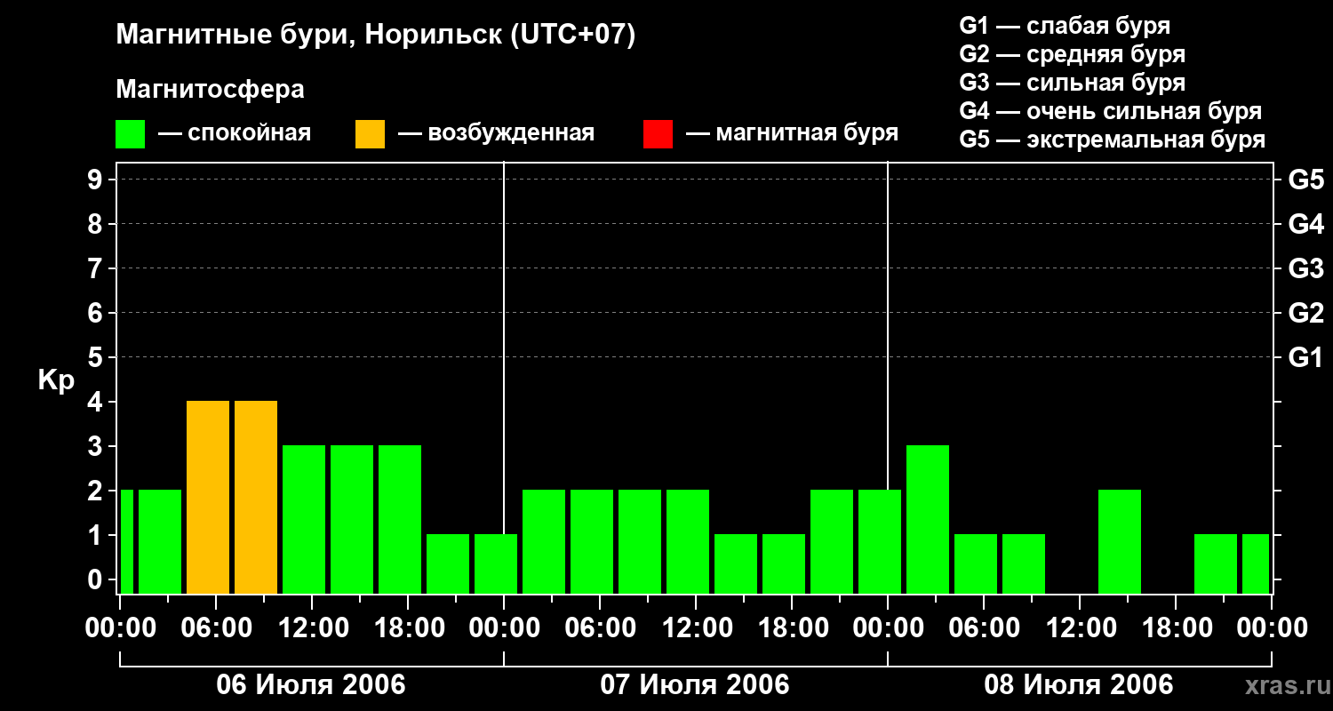 Изменения геомагнитного индекса Kp с 6 по 8 июля 2006 года для средних широт
