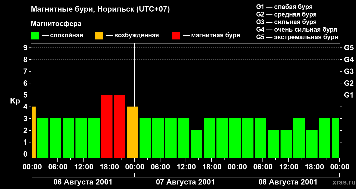 Изменения геомагнитного индекса Kp с 6 по 8 августа 2001 года для средних широт