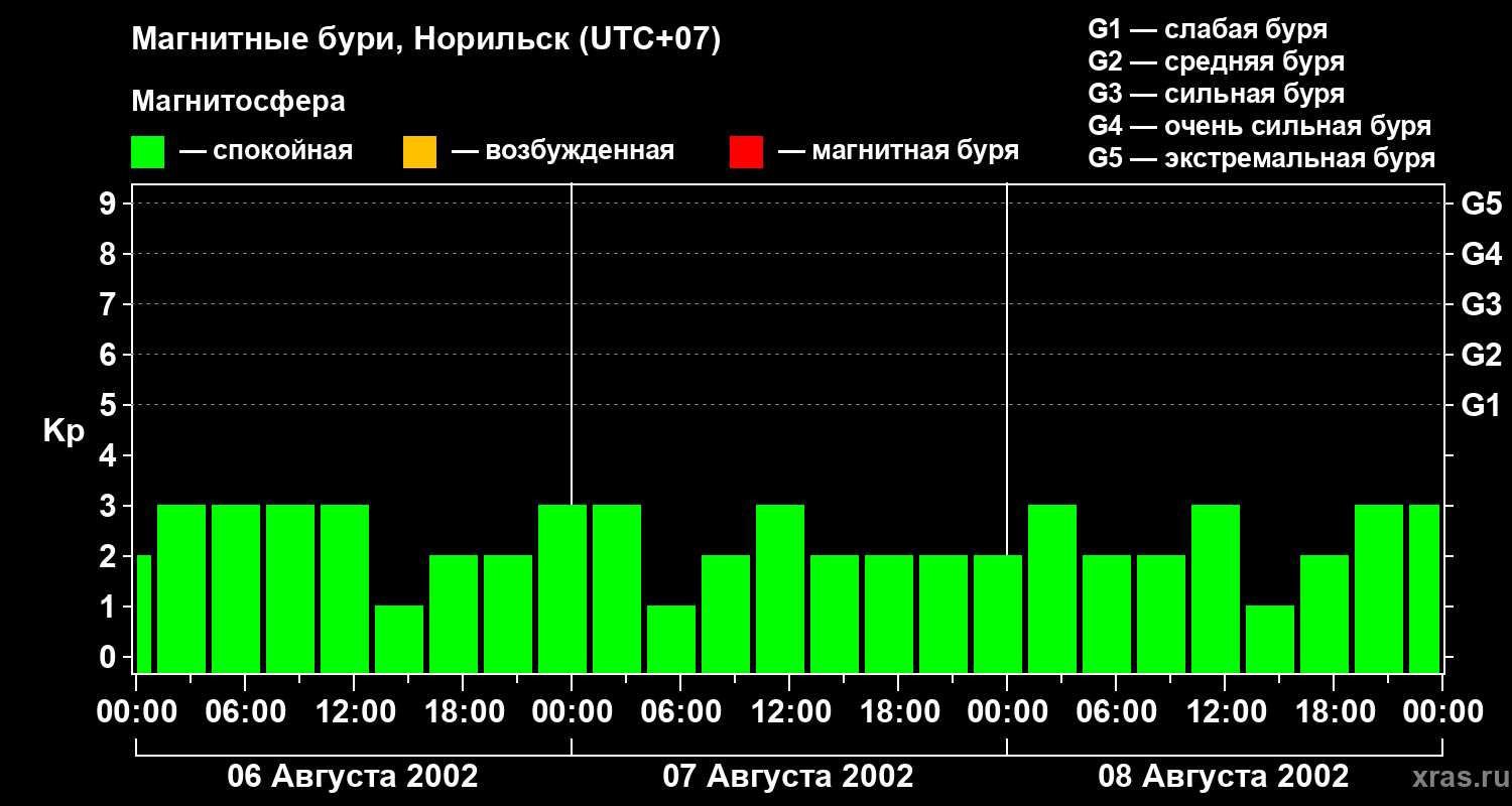 Изменения геомагнитного индекса Kp с 6 по 8 августа 2002 года для средних широт