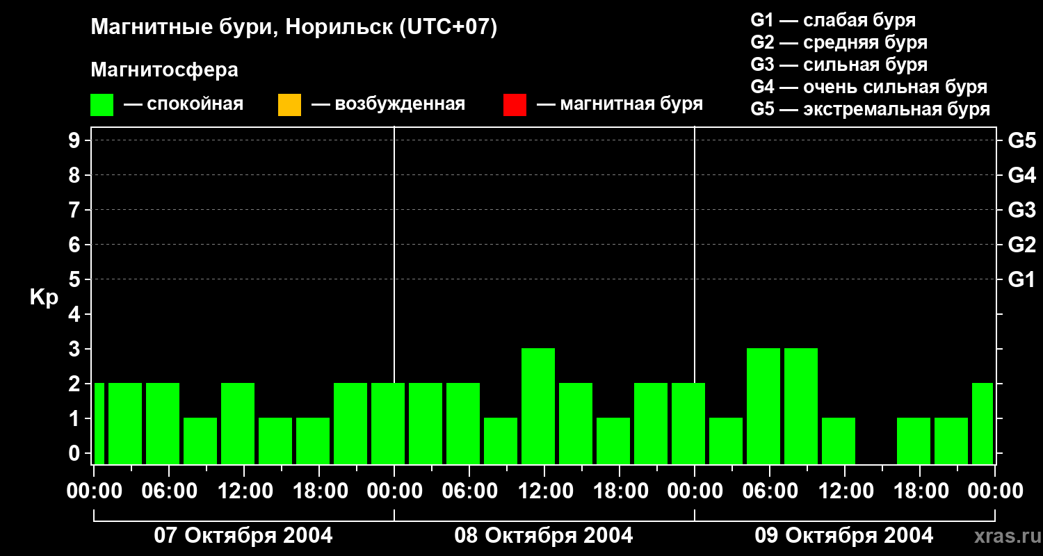 Изменения геомагнитного индекса Kp с 7 по 9 октября 2004 года для средних широт