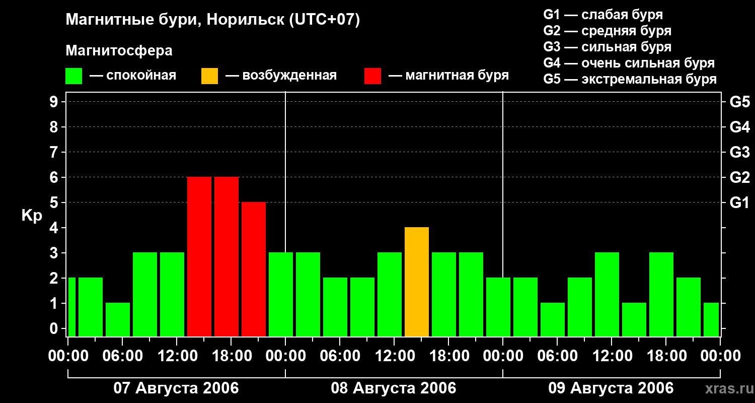 Изменения геомагнитного индекса Kp с 7 по 9 августа 2006 года для средних широт
