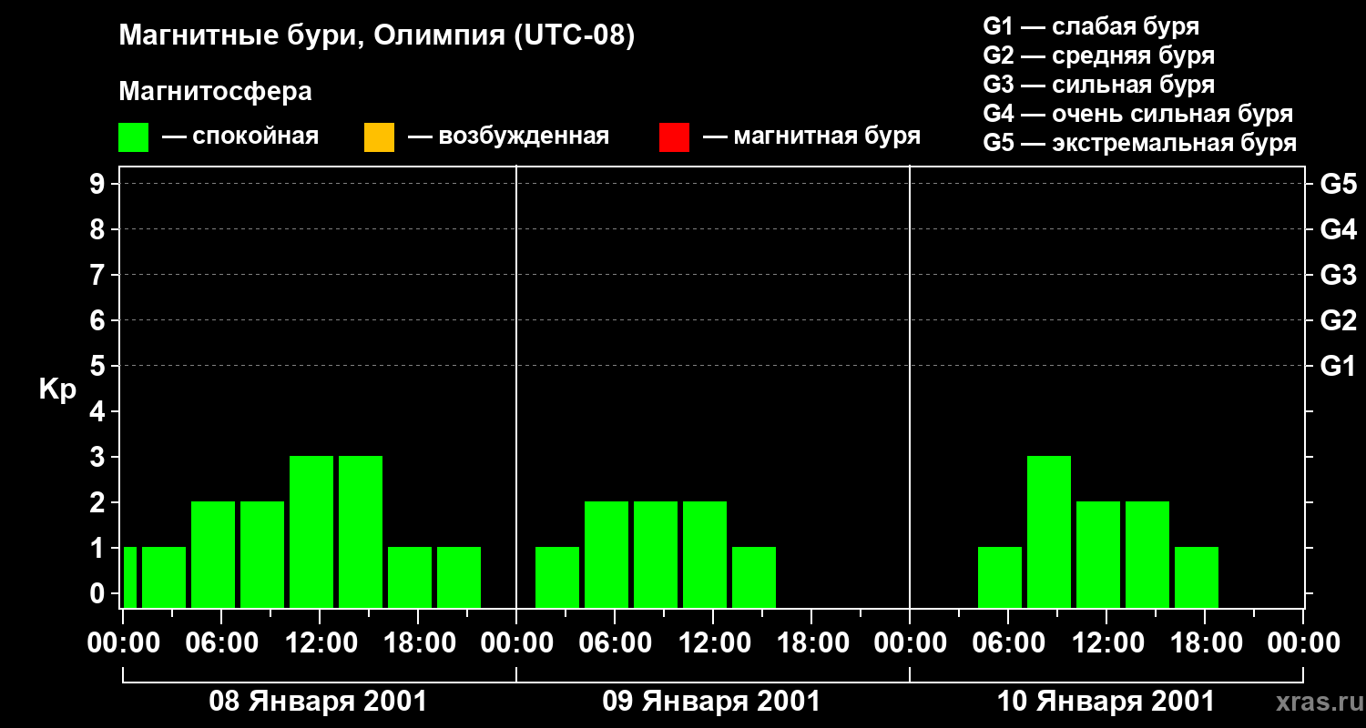 Изменения геомагнитного индекса Kp с 8 по 10 января 2001 года для средних широт