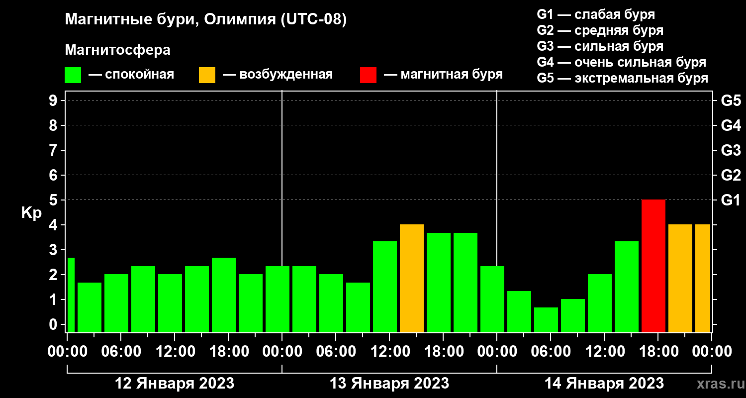 Изменения геомагнитного индекса Kp с 12 по 14 января 2023 года для средних широт
