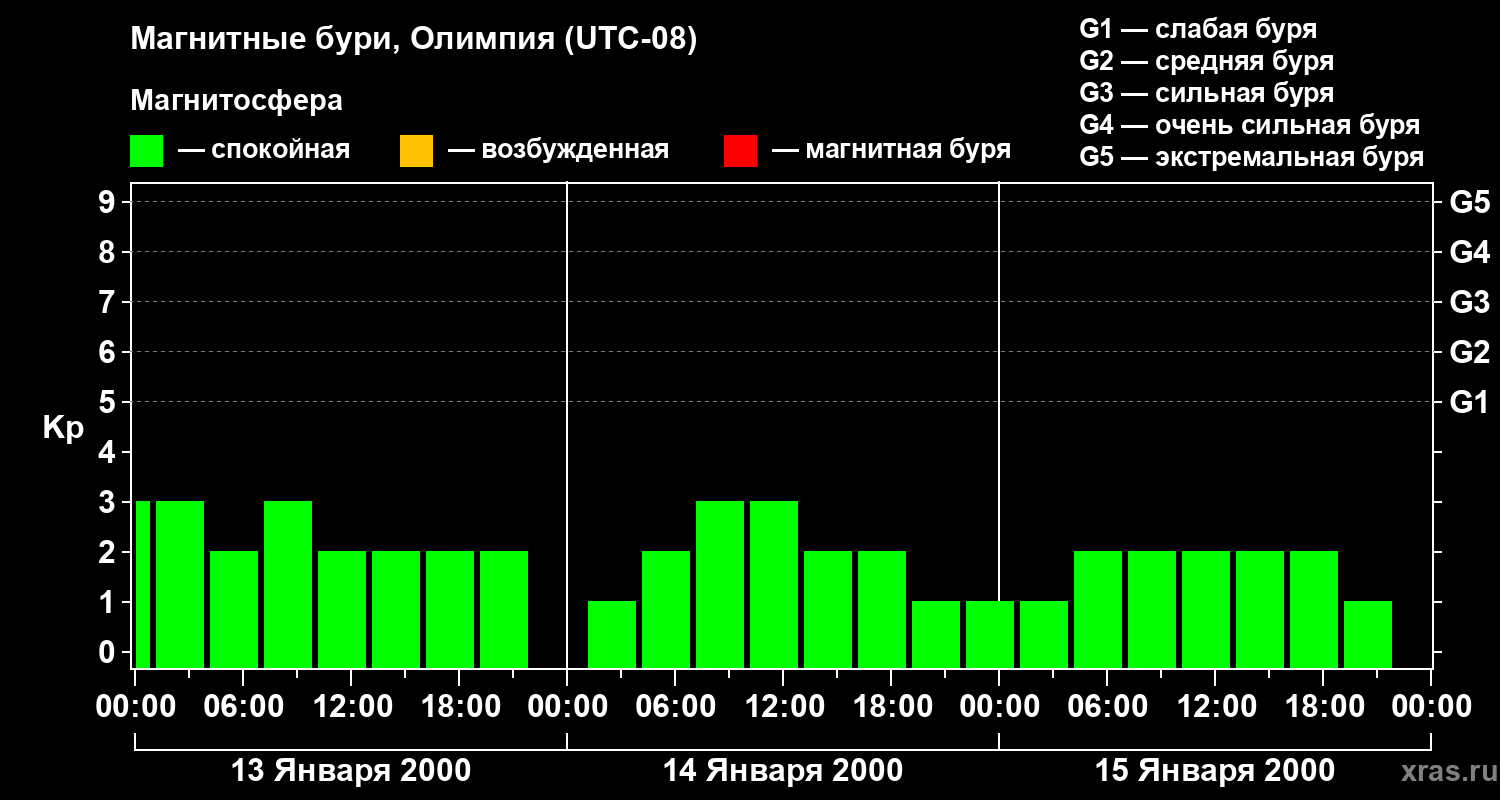 Изменения геомагнитного индекса Kp с 13 по 15 января 2000 года для средних широт