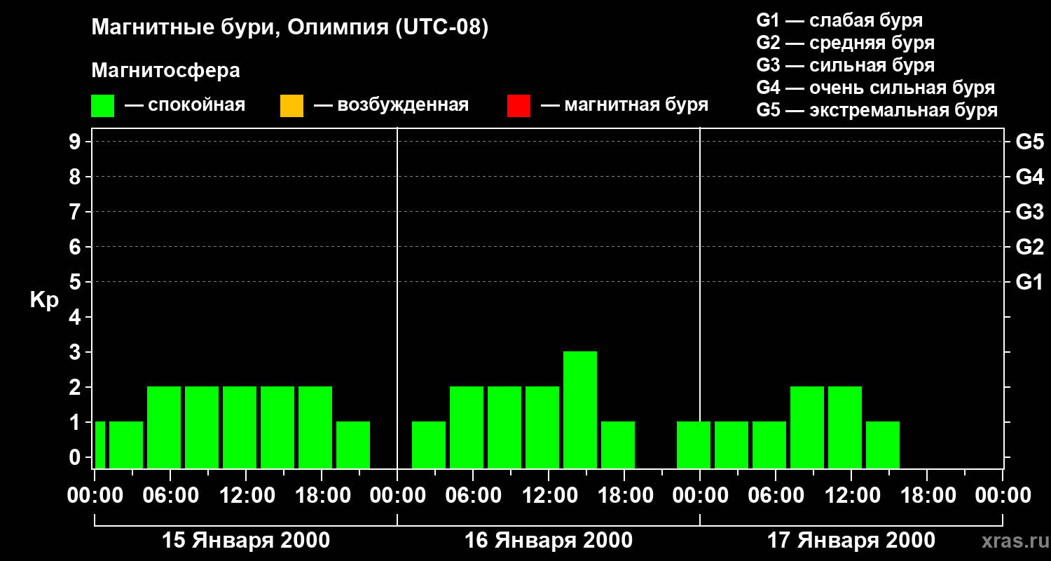 Изменения геомагнитного индекса Kp с 15 по 17 января 2000 года для средних широт