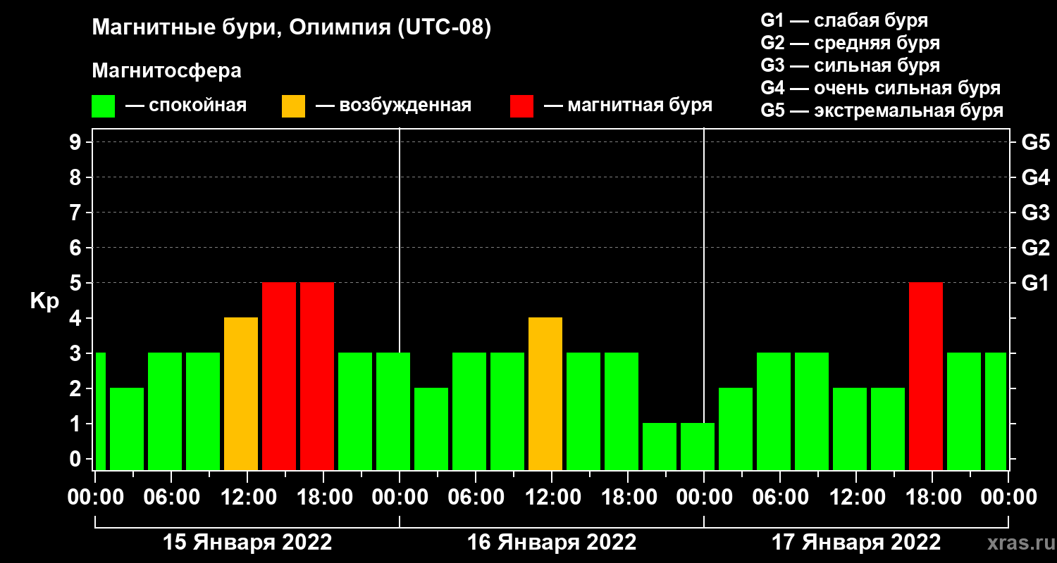 Изменения геомагнитного индекса Kp с 15 по 17 января 2022 года для средних широт