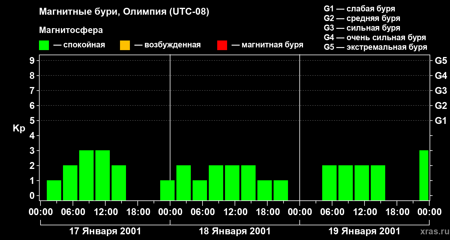 Изменения геомагнитного индекса Kp с 17 по 19 января 2001 года для средних широт
