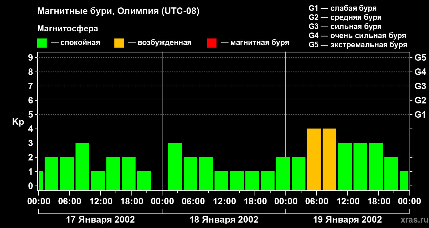 Изменения геомагнитного индекса Kp с 17 по 19 января 2002 года для средних широт