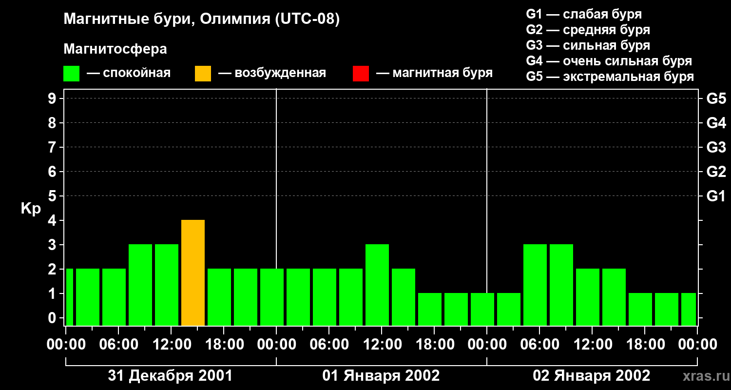 Изменения геомагнитного индекса Kp с 31 декабря 2001 года по 2 января 2002 года для средних широт